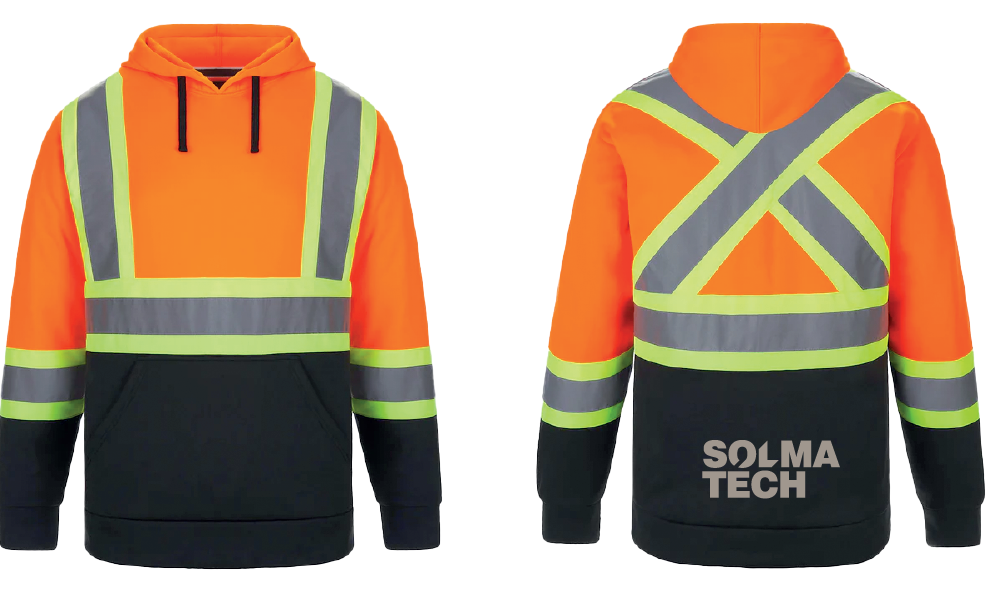 100% polyester brossé d'un cote au fini anti-boulochage, à effet de mèche, antibactérien et résistant à l'abraison. Capuchon détachable avec des bouton-pression et cordon de serrage ajustable.  Poche kangourou dotée d'une pochette dissimulée. Bandes contrastantes haute visibilité de 4 po avec ruban réfléchissant de 2 po à l'avant et au dos, de même que sur les manches.  Conception conforme aux normes CSA.