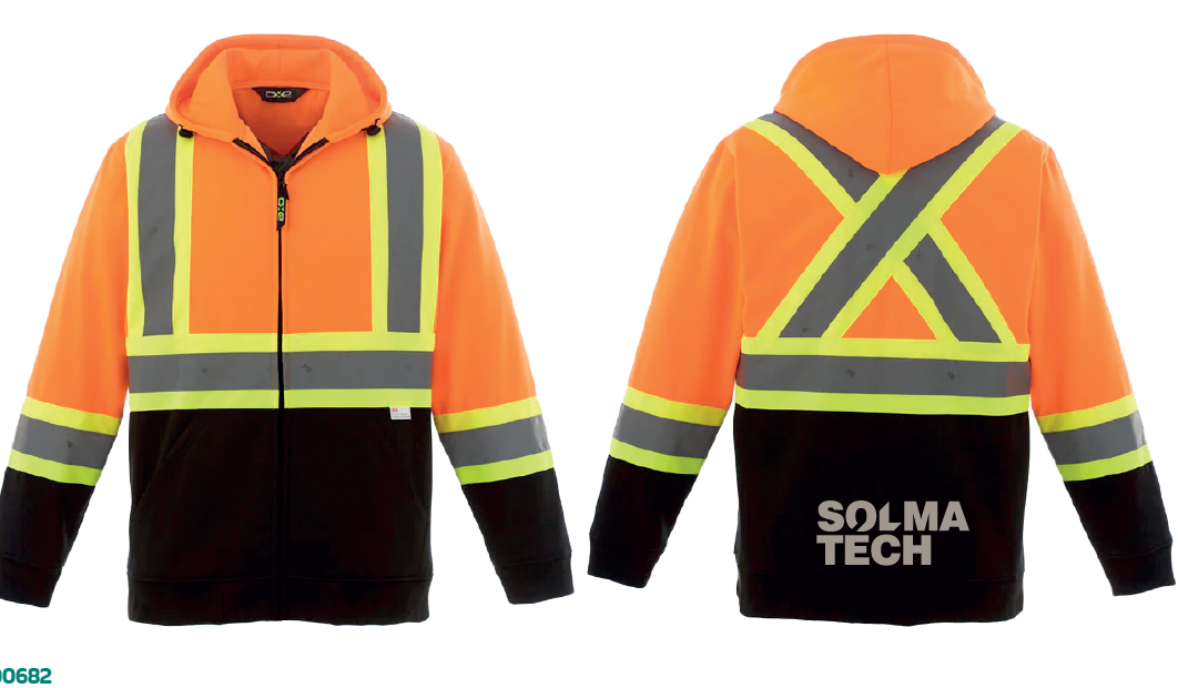 100% polyester brossé d'un cote au fini anti-boulochage, à effet de mèche, antibactérien et résistant à l'abraison. Capuchon détachable avec des bouton-pression et cordon de serrage ajustable.  Poche kangourou dotée d'une pochette dissimulée. Bandes contrastantes haute visibilité de 4 po avec ruban réfléchissant de 2 po à l'avant et au dos, de même que sur les manches.  Conception conforme aux normes CSA.